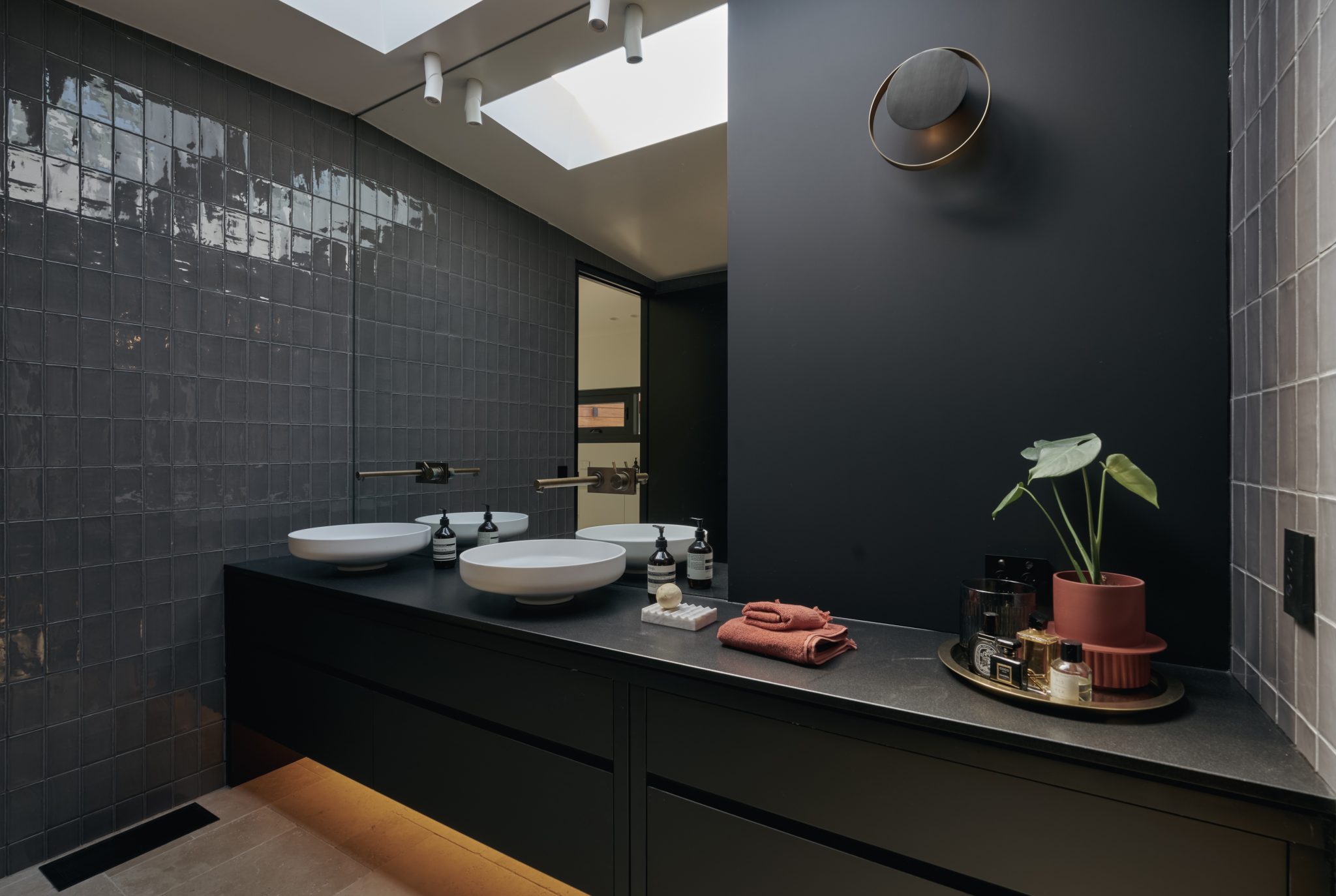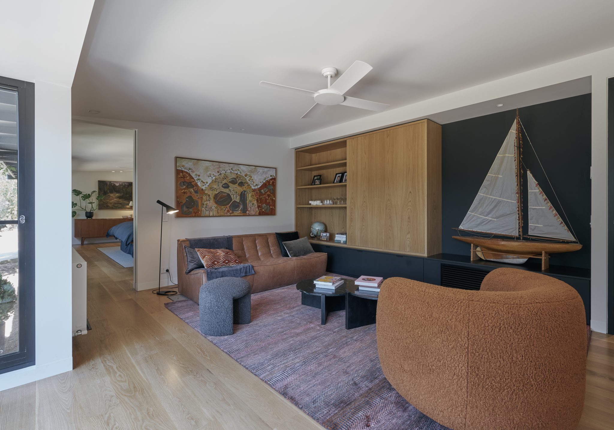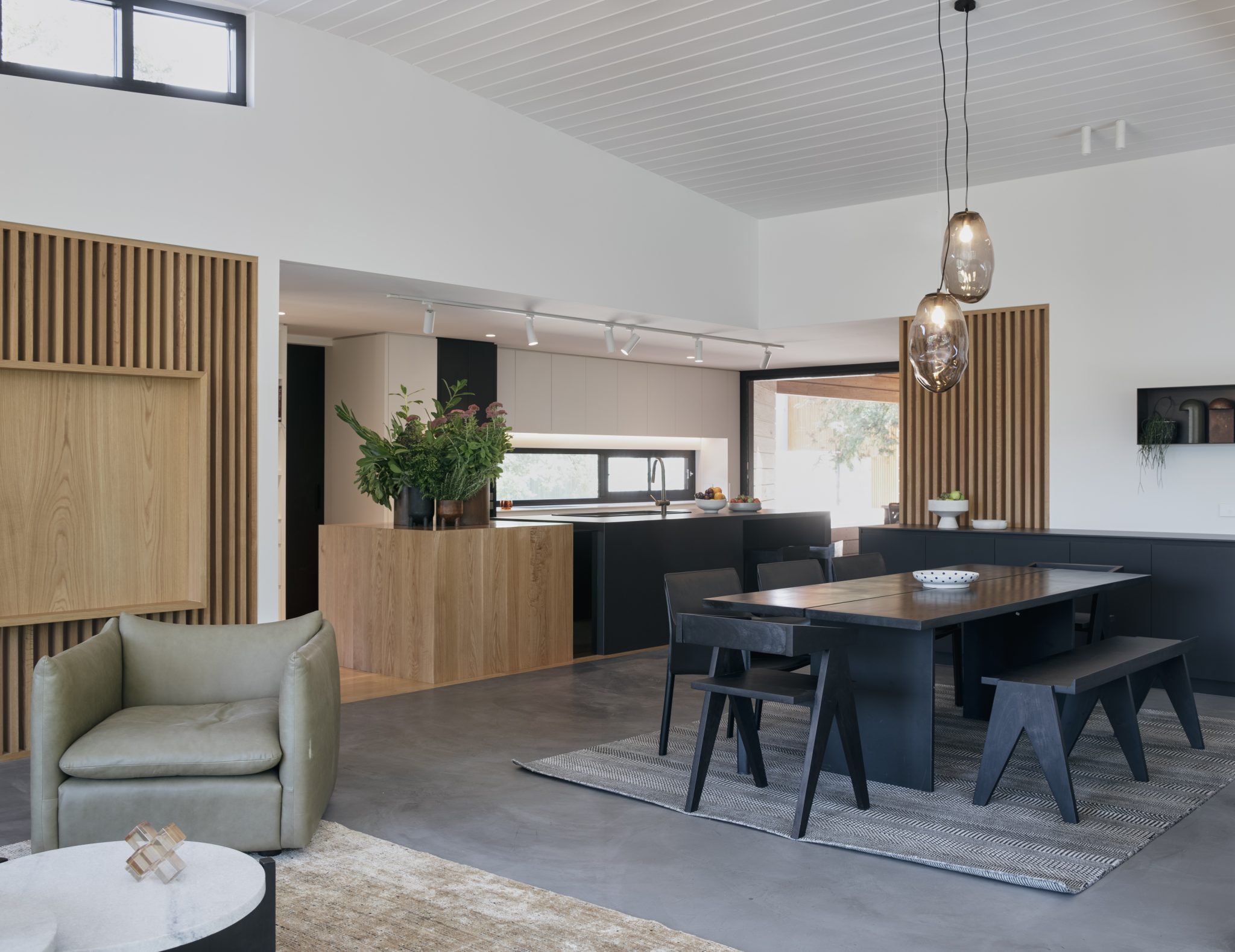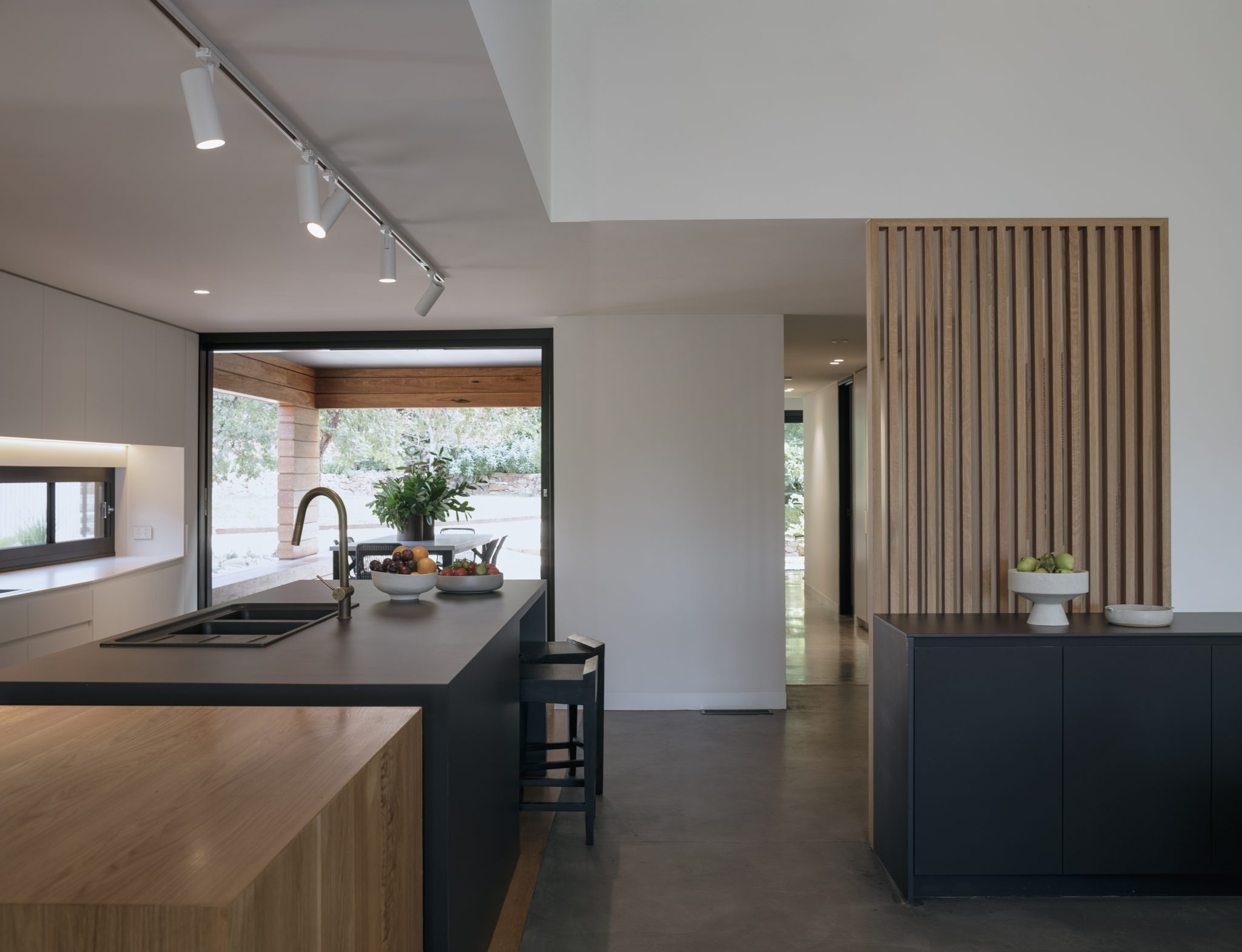 Floor to ceiling thermally broken double-glazed windows frame the main living area with its burnished concrete slab. The use of 2400mm doorways and the absence of architraves and skirting boards throughout means that nothing unnecessary distracts the eye, it also adds to the overall sense of generosity and space.