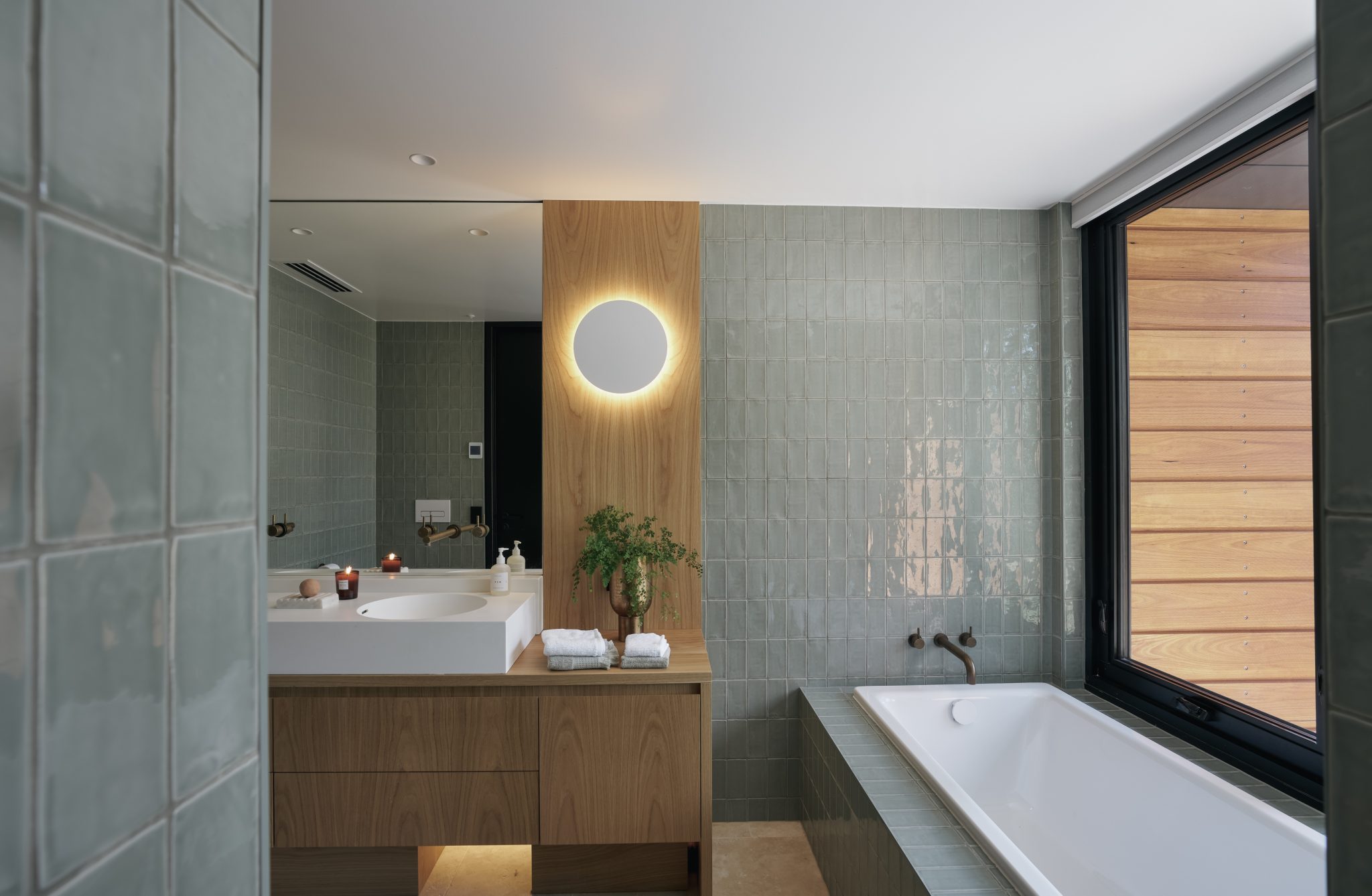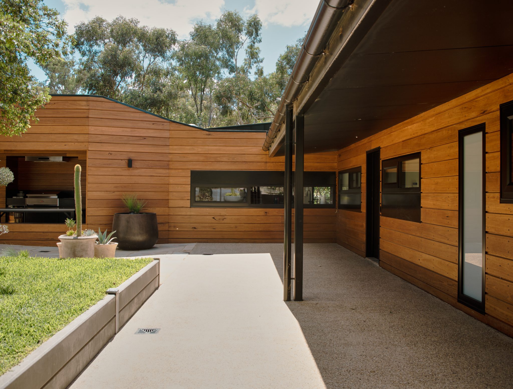 Soaring vertical panels of black Lysaght Enseam® architectural cladding are a standout feature of the exterior. The panels intersect with custom-milled blackbutt timber cladding creating a contrast of textures and colours to meld with the bush environment. The timber cladding sits under the roofline to protect it from the weather and reduce upkeep.
