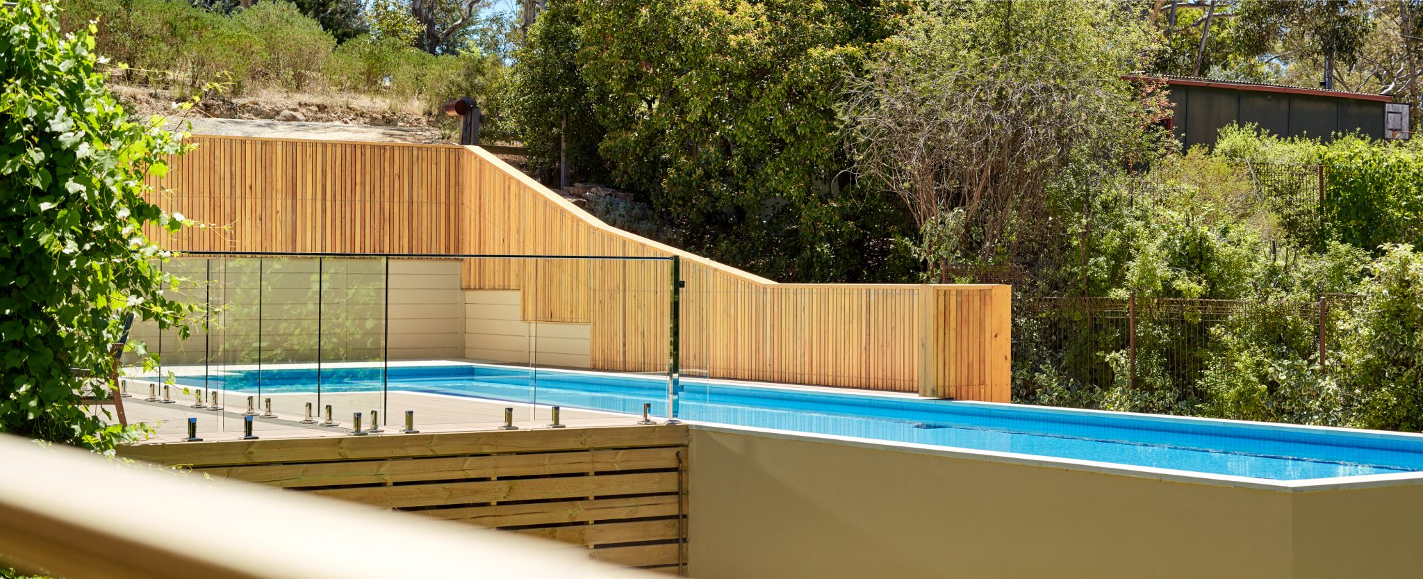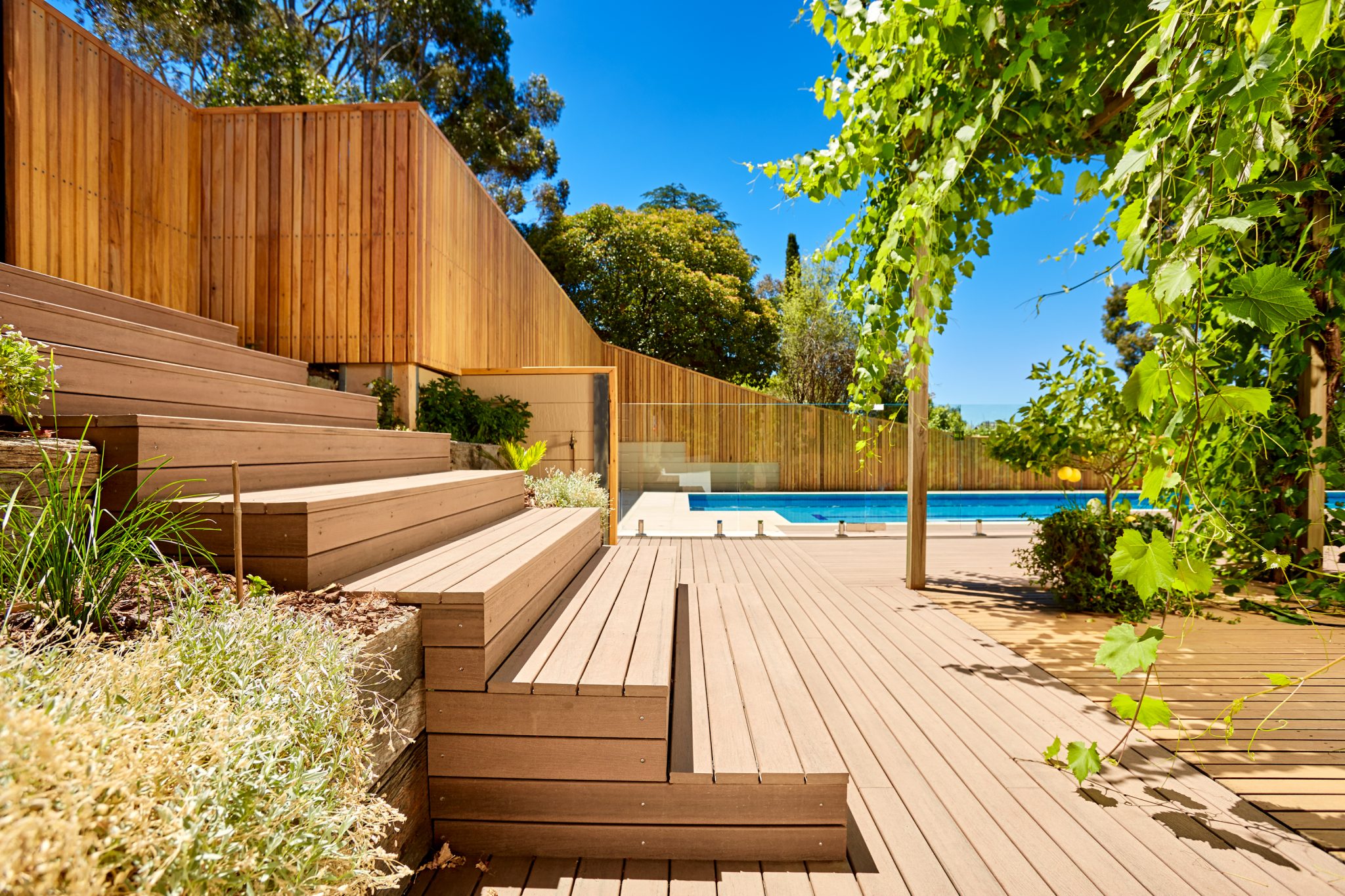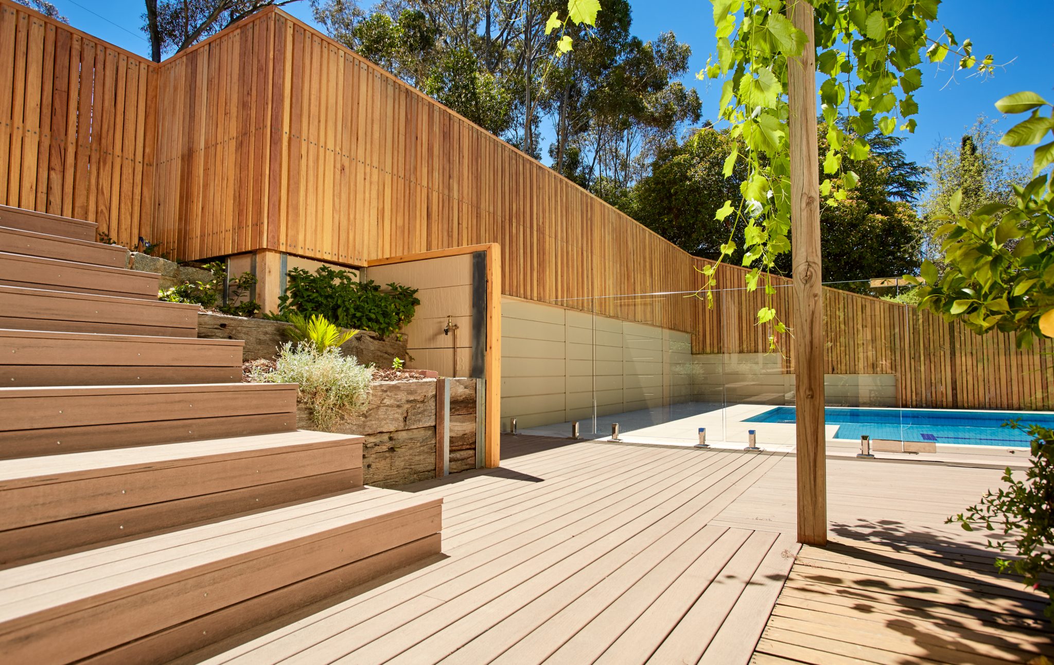 Blending seamlessly with the overall design of the home, the pool and the fall of steep sloping block, construction includes Modwood decking and steps, timber fences and screens and glass pool fencing.