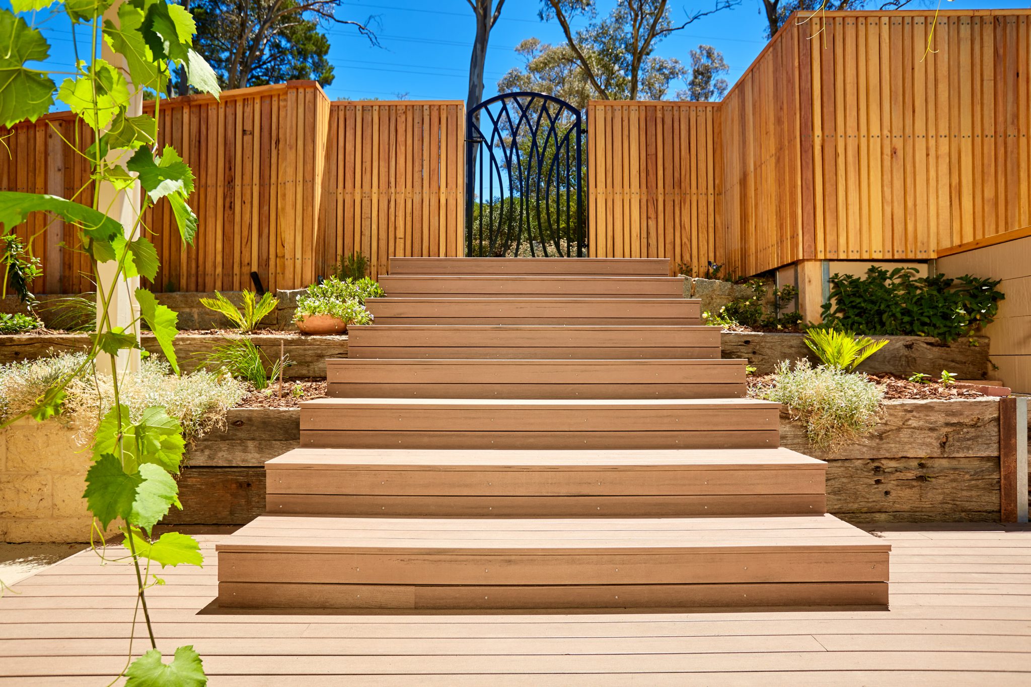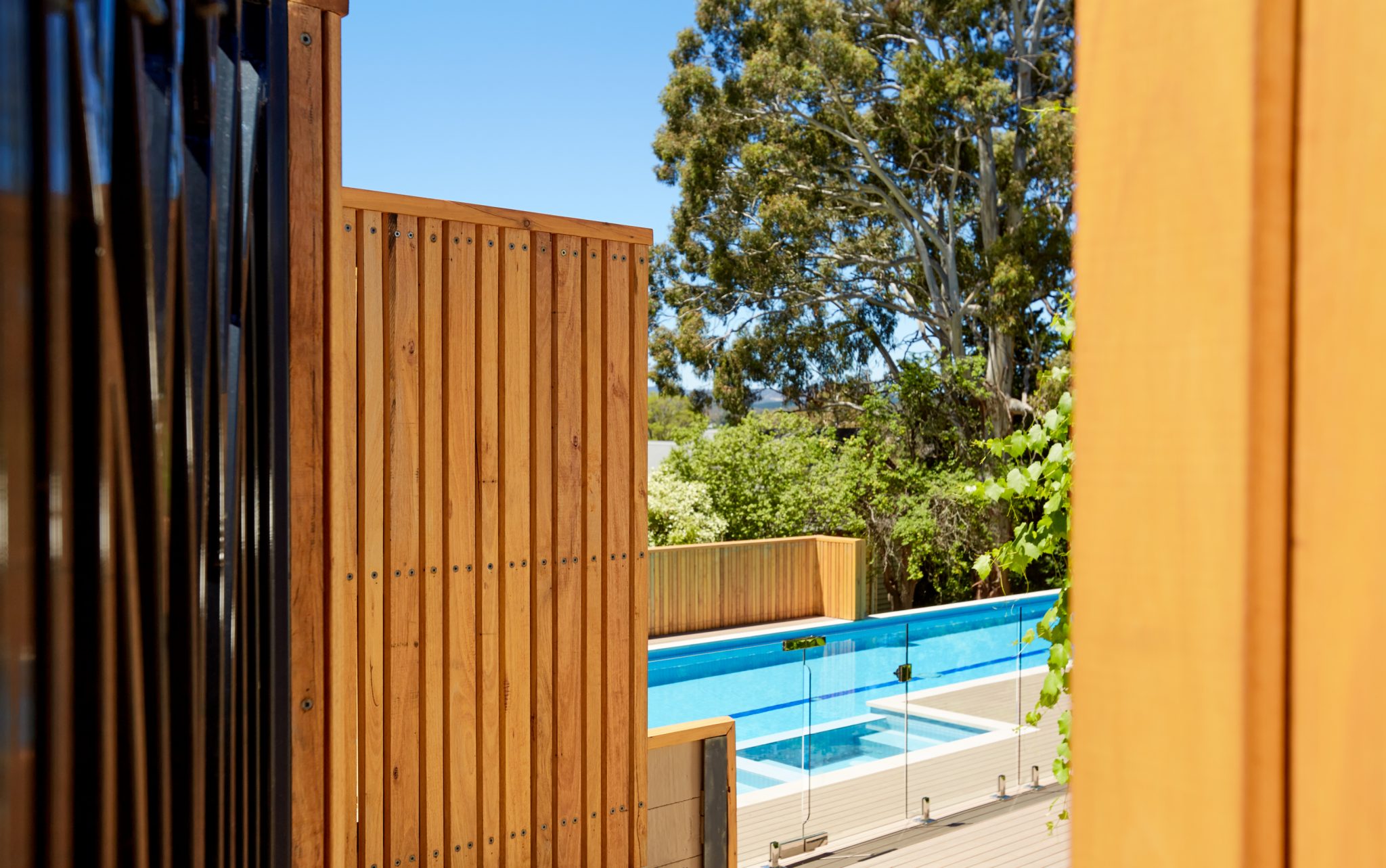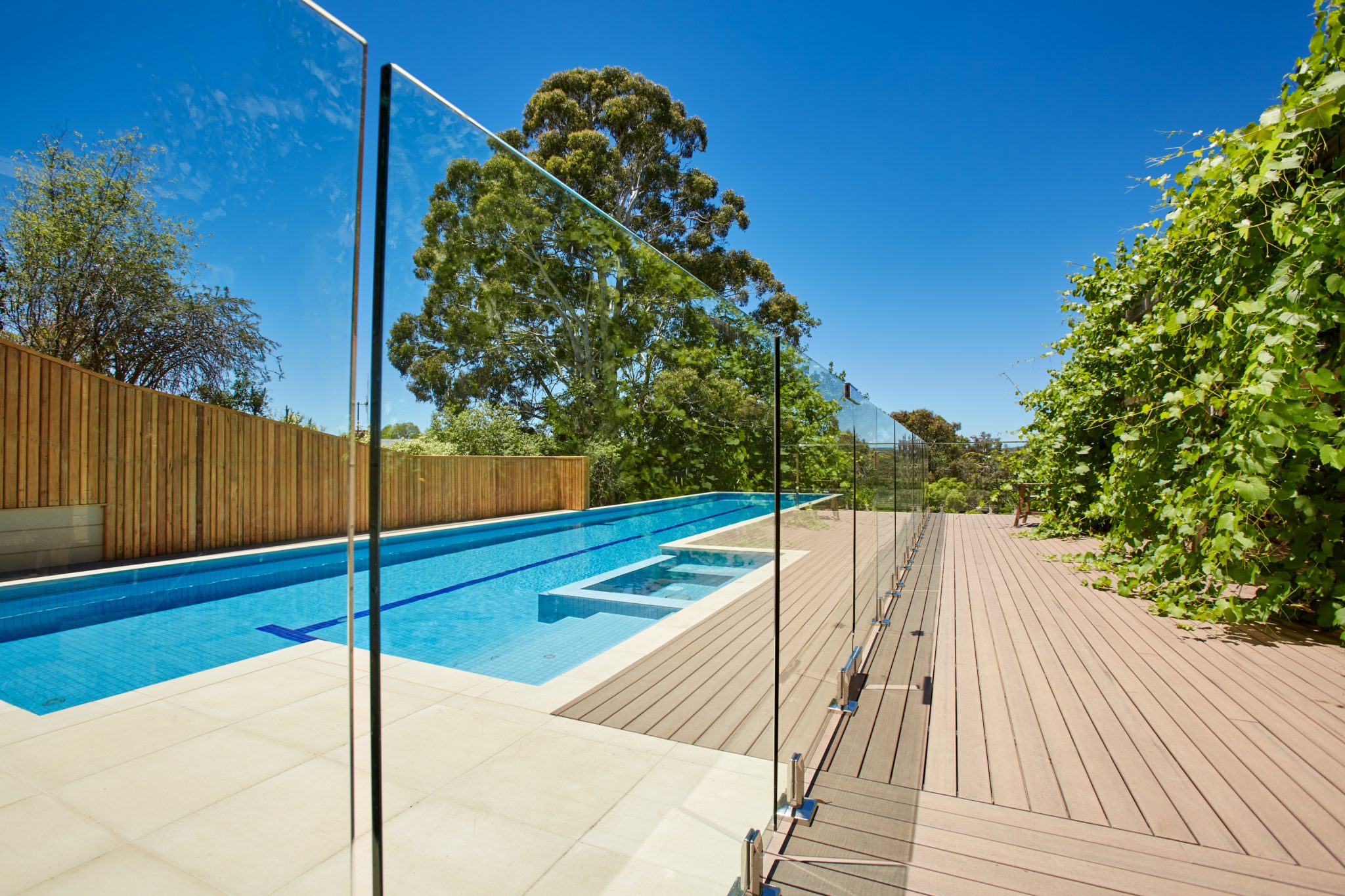 Blending seamlessly with the overall design of the home, the pool and the fall of steep sloping block, construction includes Modwood decking and steps, timber fences and screens and glass pool fencing.
